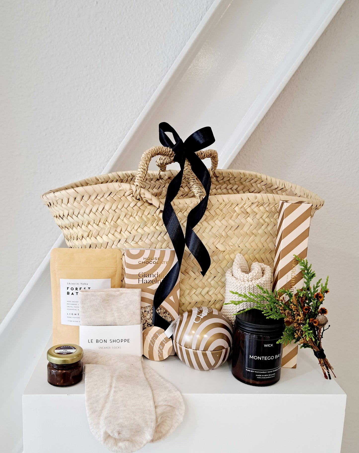 Because she deserves nothing less than indulgence. This festive basket brims with House of Chocolate treats, Le Bon Shoppe oatmeal socks, a Wick candle, Light + Vessel bath soak, Te Mata Fig compote, Bianca Lorenne wash cloth, and more. Beautifully presented in a large market basket with dried florals and a hand-written card, the perfect way to make her Christmas extra special.